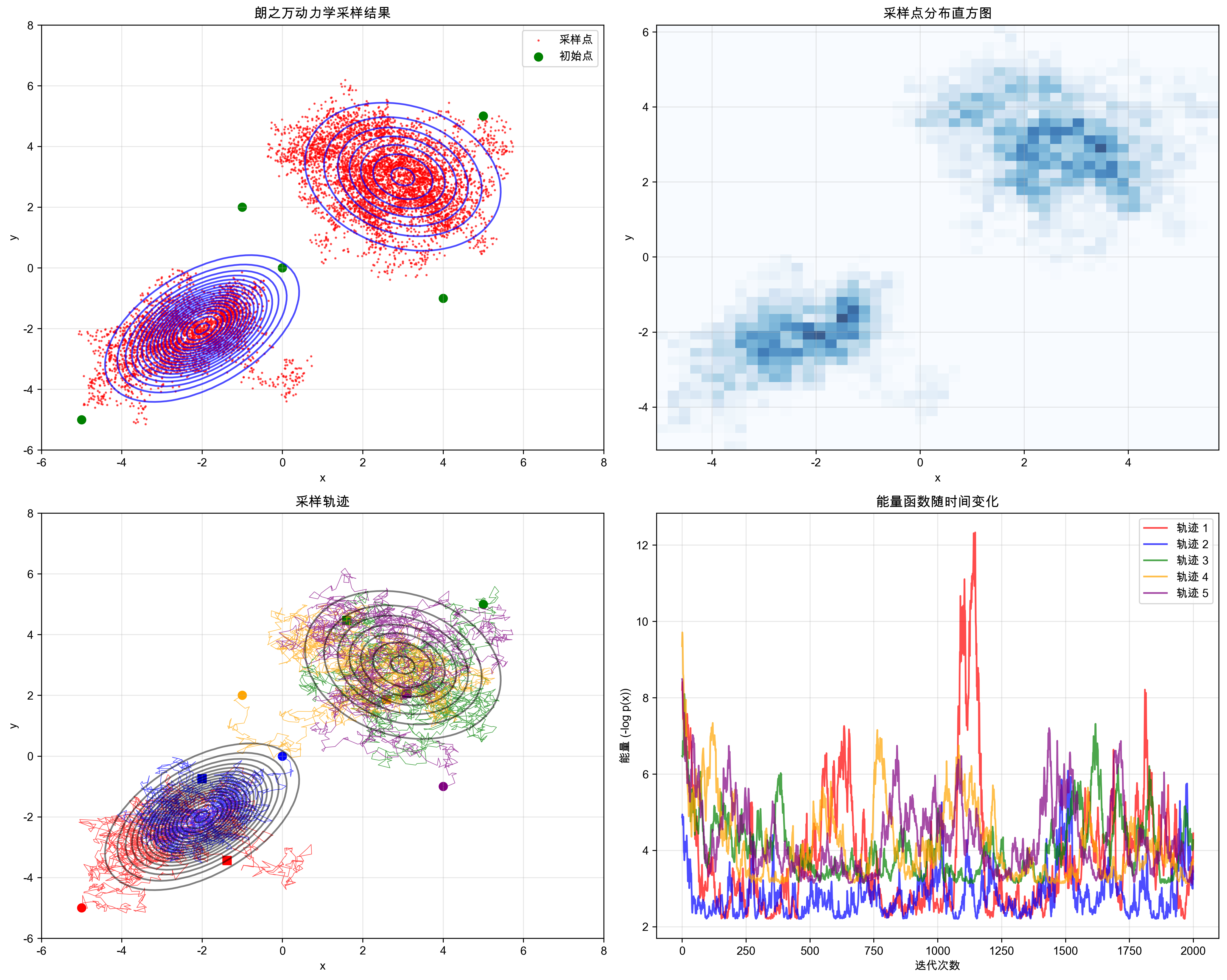 $$ \mathbf{x_{t+1}} = \mathbf{x_{t}} + \tau \nabla_{\mathbf{x}} \log p_t(\mathbf{x}) $$其中 $\tau > 0$ 是步长参数,控制每次更新的幅度。然而,这种纯梯度上升方法存在一个根本性问题:样本最终会收敛到概率密度的局部最大值点,无法实现对整个目标分布的采样。